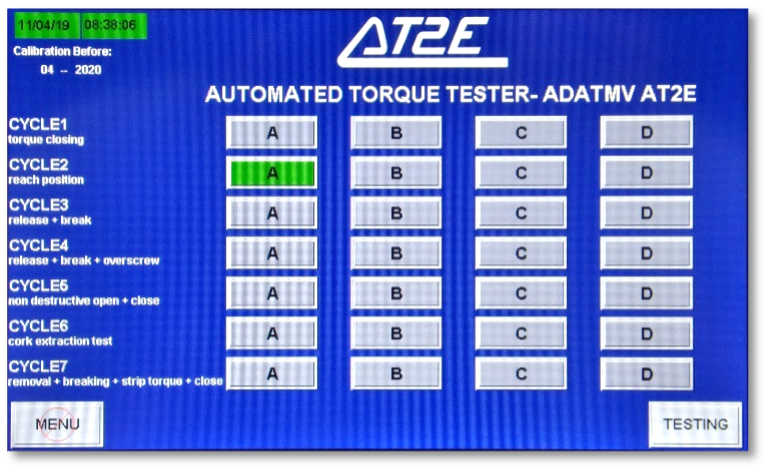 • 7 ciclos de medición: cierre / punto cero / liberación + rotura / liberación + rotura + sobre torque / prueba no destructiva / extracción de corcho / apertura + rotura + torque de rotura del anillo de garantía + cierre.